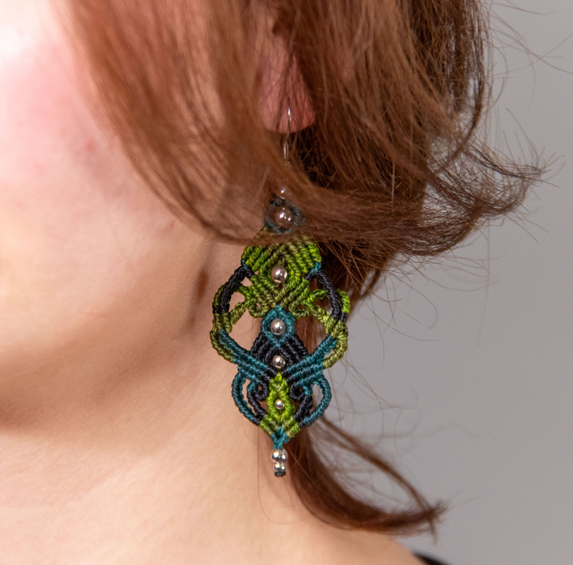 Boucles d'oreilles en micro-macramé aux motifs organiques. Trois losanges s'entrelacent en cascade, créant un jeu de courbes et de vides. Les fils noir, vert olive et émeraude se mêlent harmonieusement, ponctués de perles argentées. Une pièce qui évoque les lianes ou racine d'une forêt.