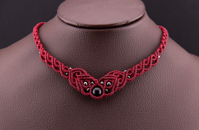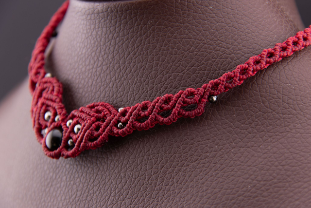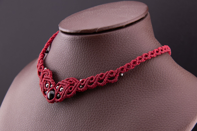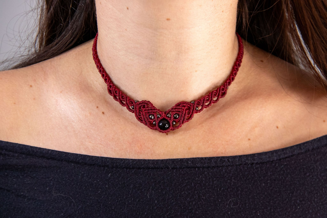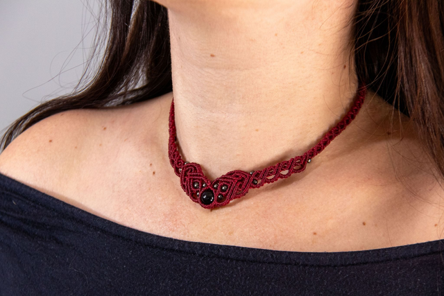 Ras de cou en micro-macramé rouge au motif géométrique inspiré des toiles d'araignée. Les entrelacs forment une composition symétrique autour d'une obsidienne noire centrale. Les perles métalliques noires ponctuent le tressage, créant un contraste élégant. Pièce légère et confortable pour un port quotidien.