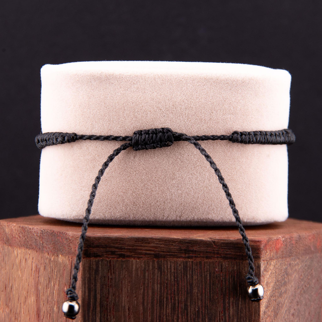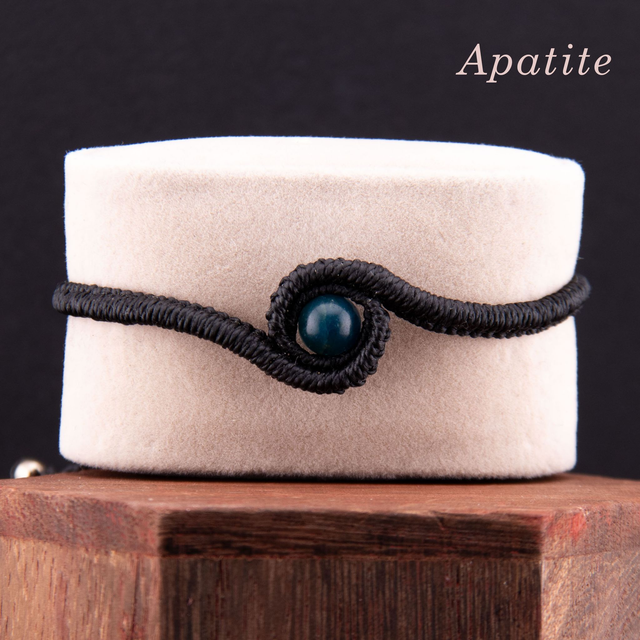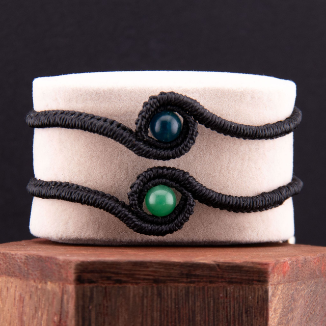 Bracelet en micro-macramé noir au motif œil protecteur. Une pierre naturelle ronde est enchâssée dans un tressage qui forme un regard stylisé. Design minimaliste et symbolique, parfait pour un port quotidien ou à accumuler avec d'autres bracelets.