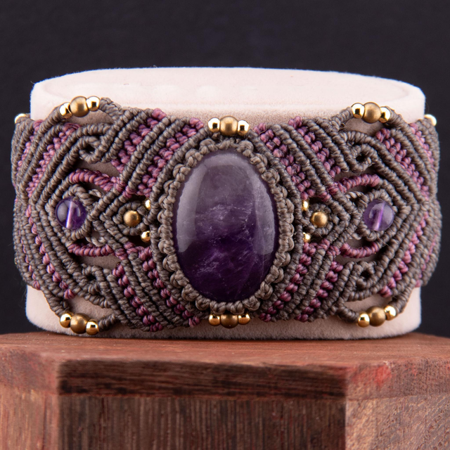 Manchette en micro-macramé gris et rose. Une améthyste ovale centrale est entourée de motifs géométriques, ponctués de perles d'améthyste naturelles et de perles dorées en laiton. Le tressage alterne chevrons et volutes, créant un effet précieux et raffiné.