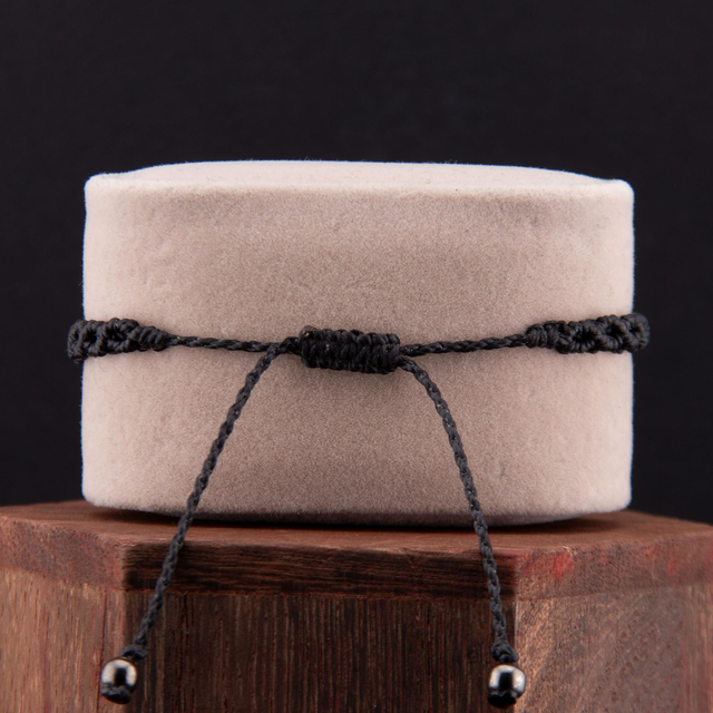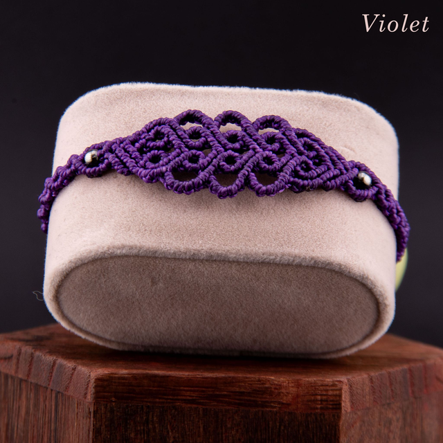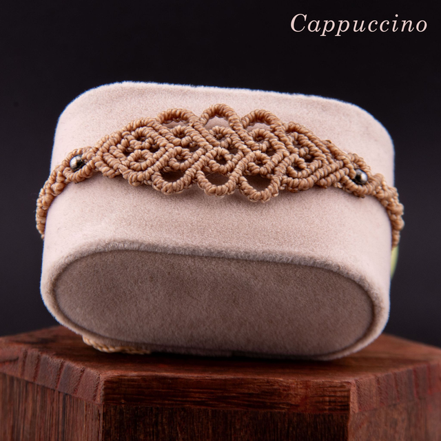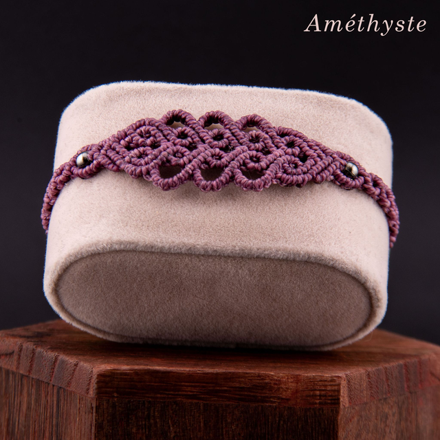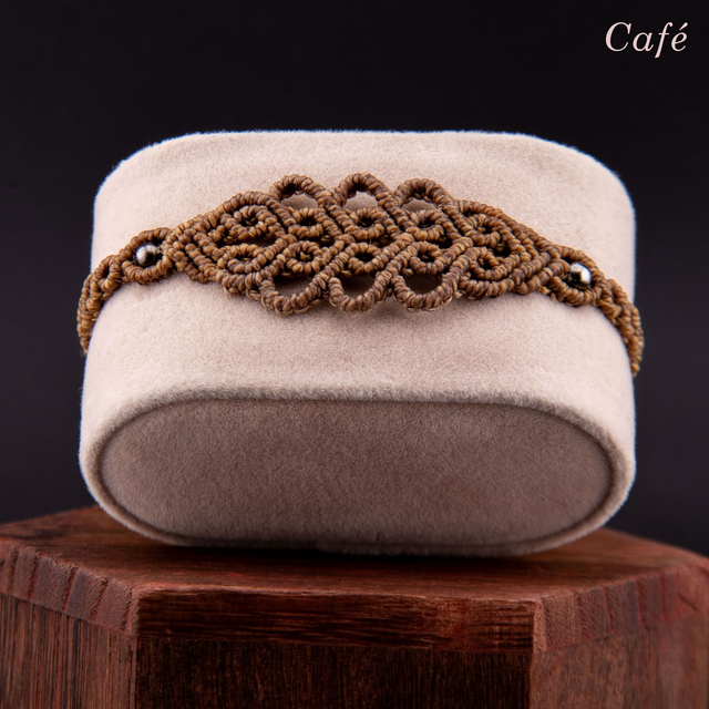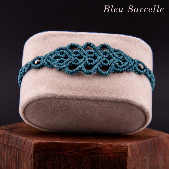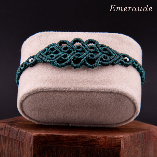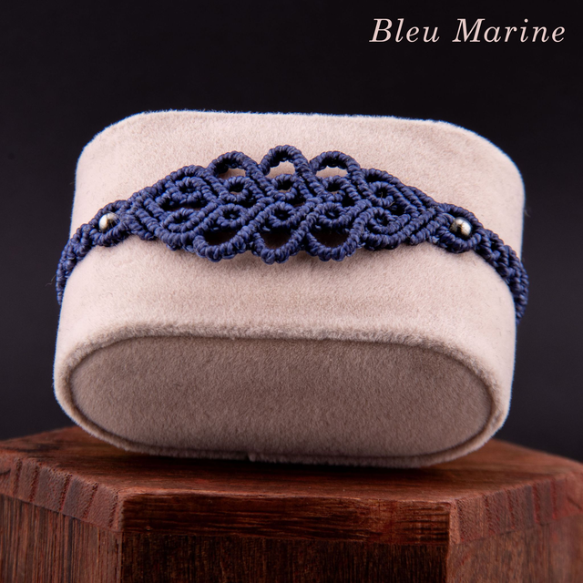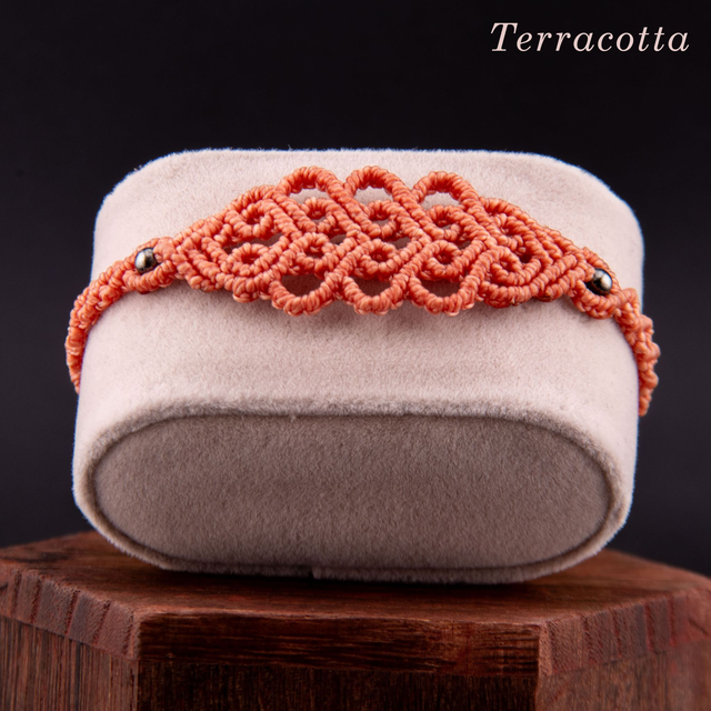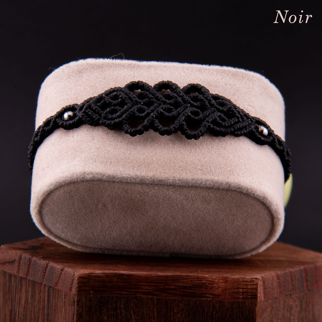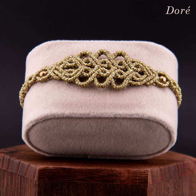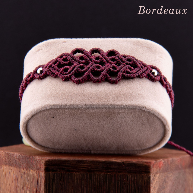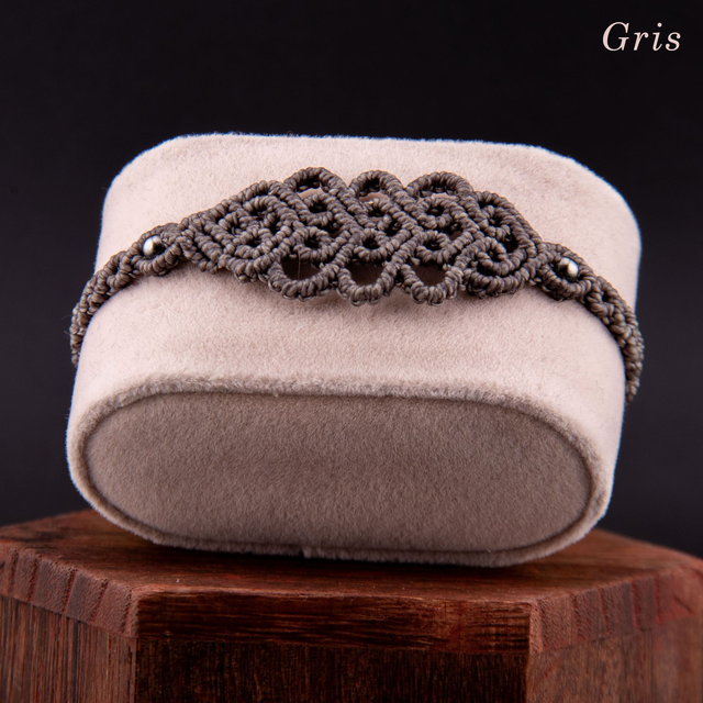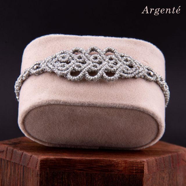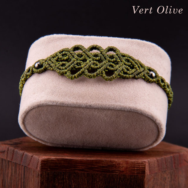 Bracelet en micro-macramé au motif d'arabesques entrelacées. Les courbes fluides s'entrecroisent et créer un motif fin et ajouré inspiré de la dentelle, créant un design élégant et intemporel. Les perles métalliques ponctuent le tressage, ajoutant une touche de brillance discrète. Léger et confortable pour un port quotidien qui s'accumule facilement avec d'autres bracelets.